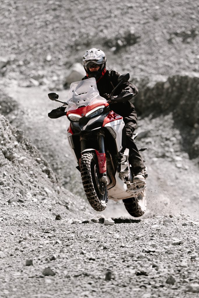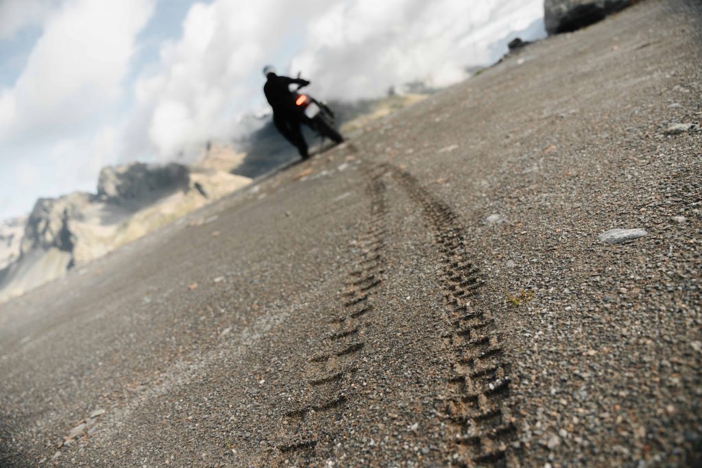 En particular, los bloques de la banda de rodadura del neumático delantero, inclinados pronunciadamente hacia abajo en la dirección de marcha, mejoran el agarre durante la frenada en terrenos off-road; mientras, el diseño de los bloques del neumático trasero, orientado exactamente en la dirección opuesta, proporciona una tracción óptima durante la aceleración.