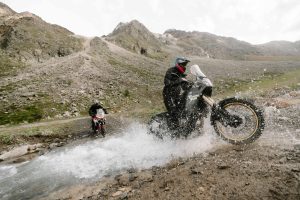 En particular, los bloques de la banda de rodadura del neumático delantero, inclinados pronunciadamente hacia abajo en la dirección de marcha, mejoran el agarre durante la frenada en terrenos off-road; mientras, el diseño de los bloques del neumático trasero, orientado exactamente en la dirección opuesta, proporciona una tracción óptima durante la aceleración.